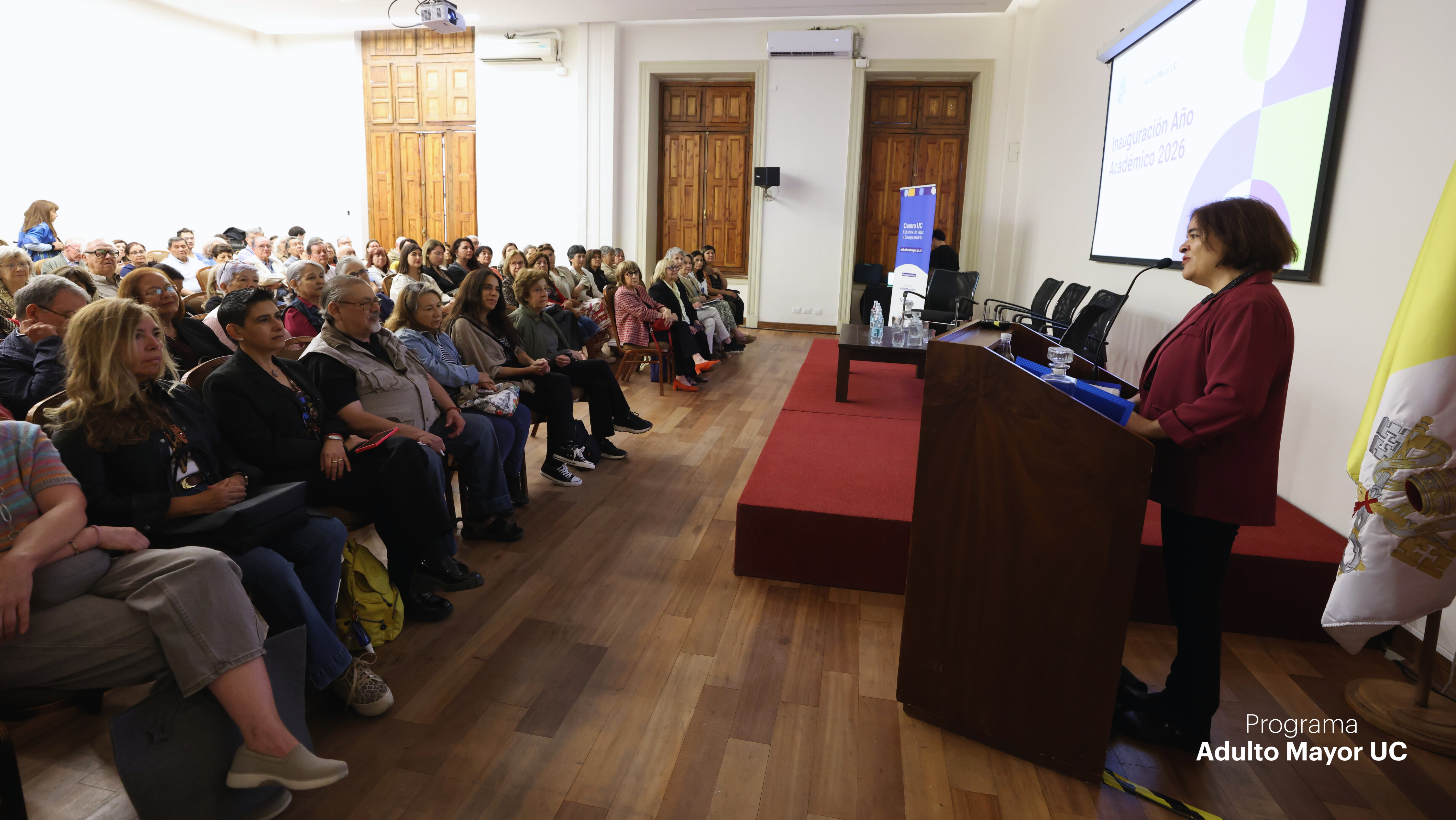 Más de 120 personas fueron parte de la bienvenida al año académico del Programa Adulto Mayor de la Pontificia Universidad Católica de Chile, entre ellas autoridades universitarias, estudiantes, docentes y representantes de organizaciones que colaboran con el programa para acercar la educación a las personas mayores.