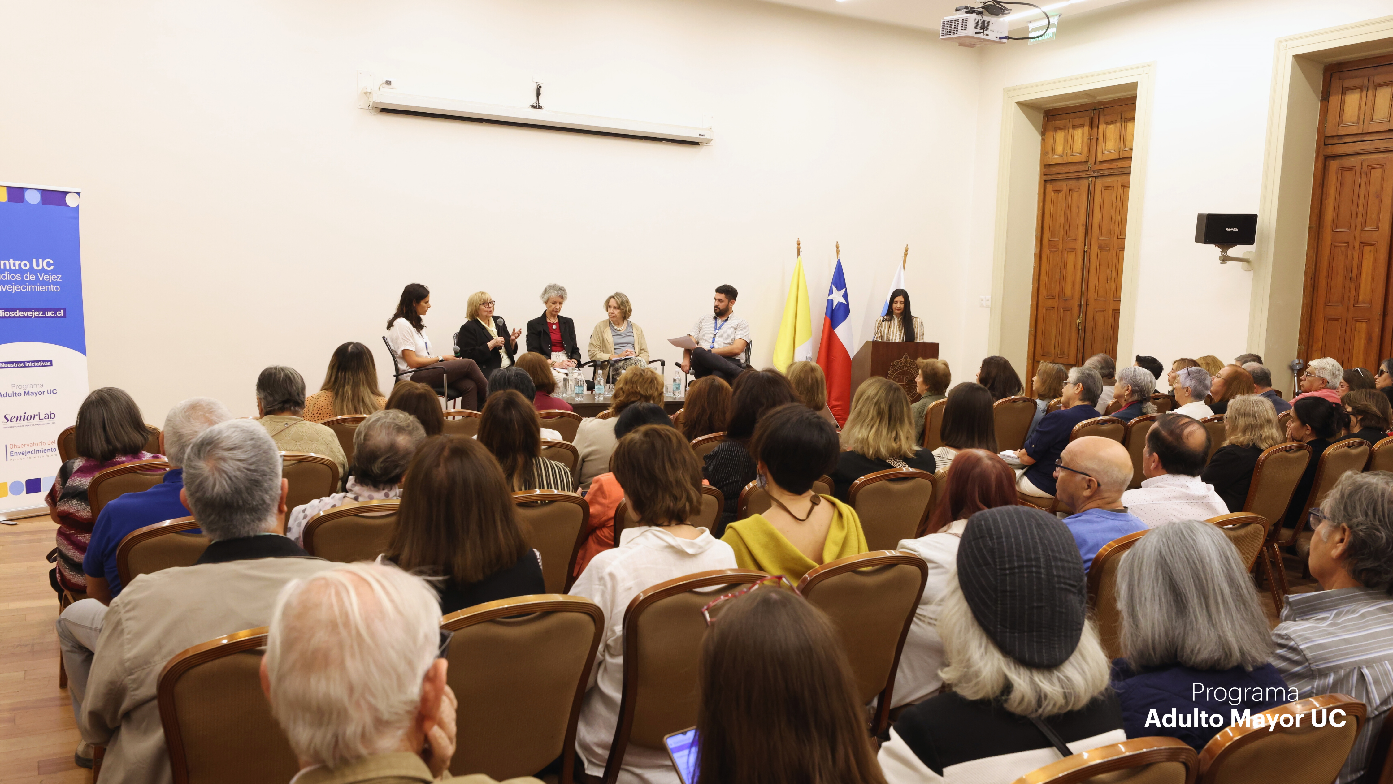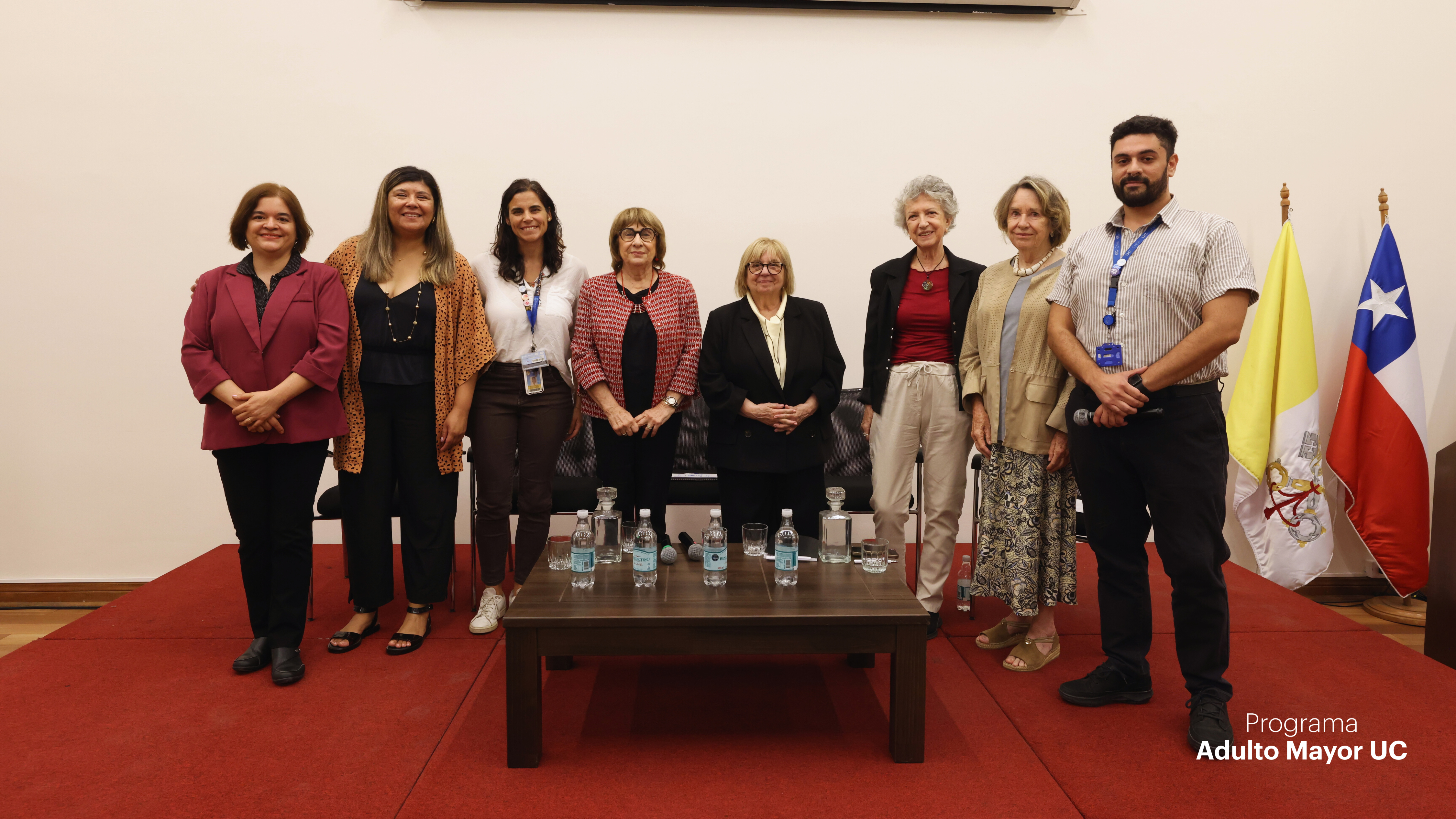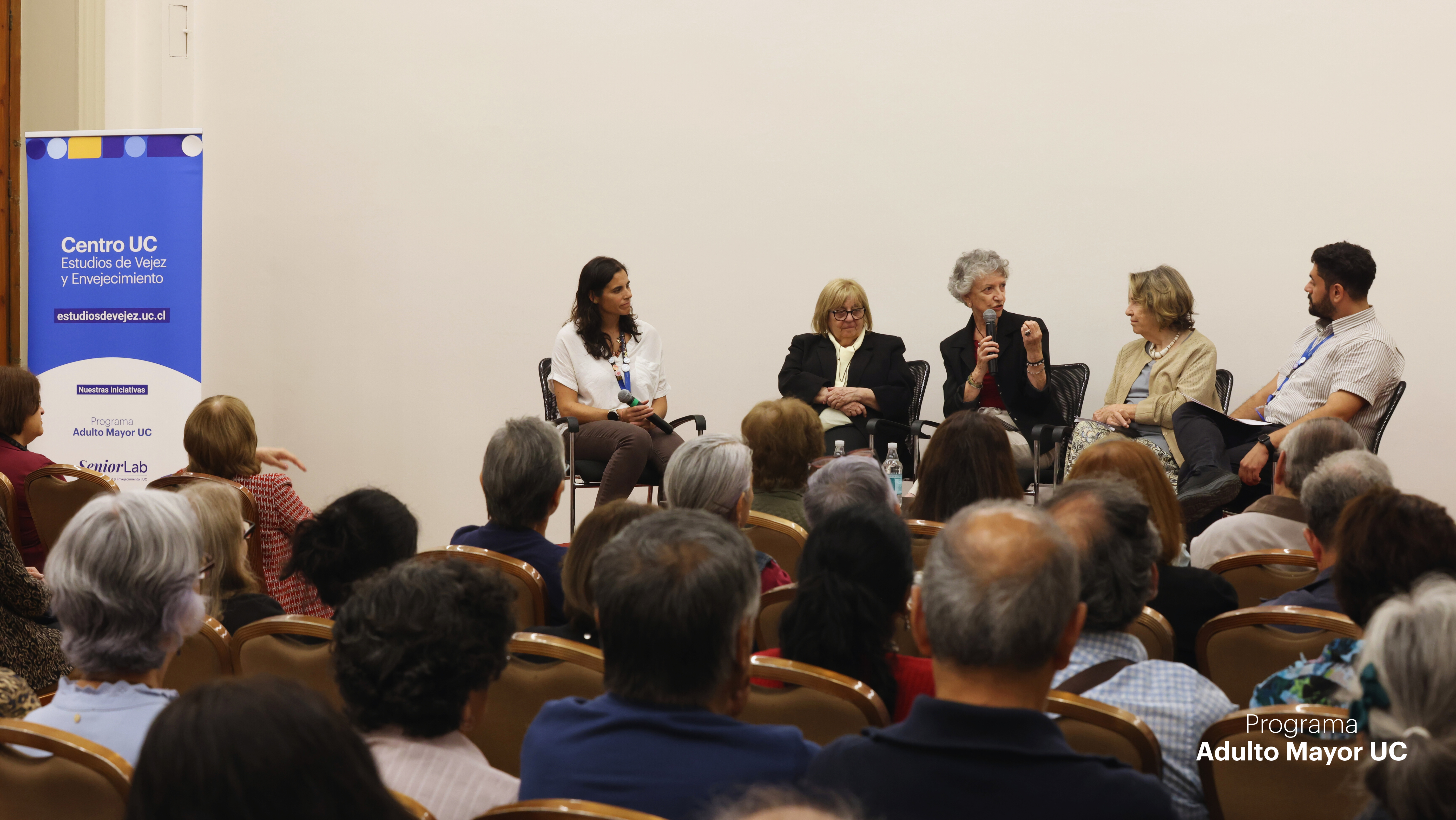 La jornada también incluyó un panel de conversación que reunió distintas miradas vinculadas al trabajo con personas mayores. En esta instancia participaron Alonso Calderón, cientista político y coordinador del programa 60+ Digital; Margarita Errázuriz, fundadora del Ciclo de Espiritualidad del Programa Adulto Mayor UC; Cecilia Marticorena, estudiante de los cursos del programa e integrante del Comité Asesor de Personas Mayores; Fernanda Calvo, kinesióloga UC, docente y líder del programa Camina 60+; junto a la propia Montse Amorós como experta invitada.