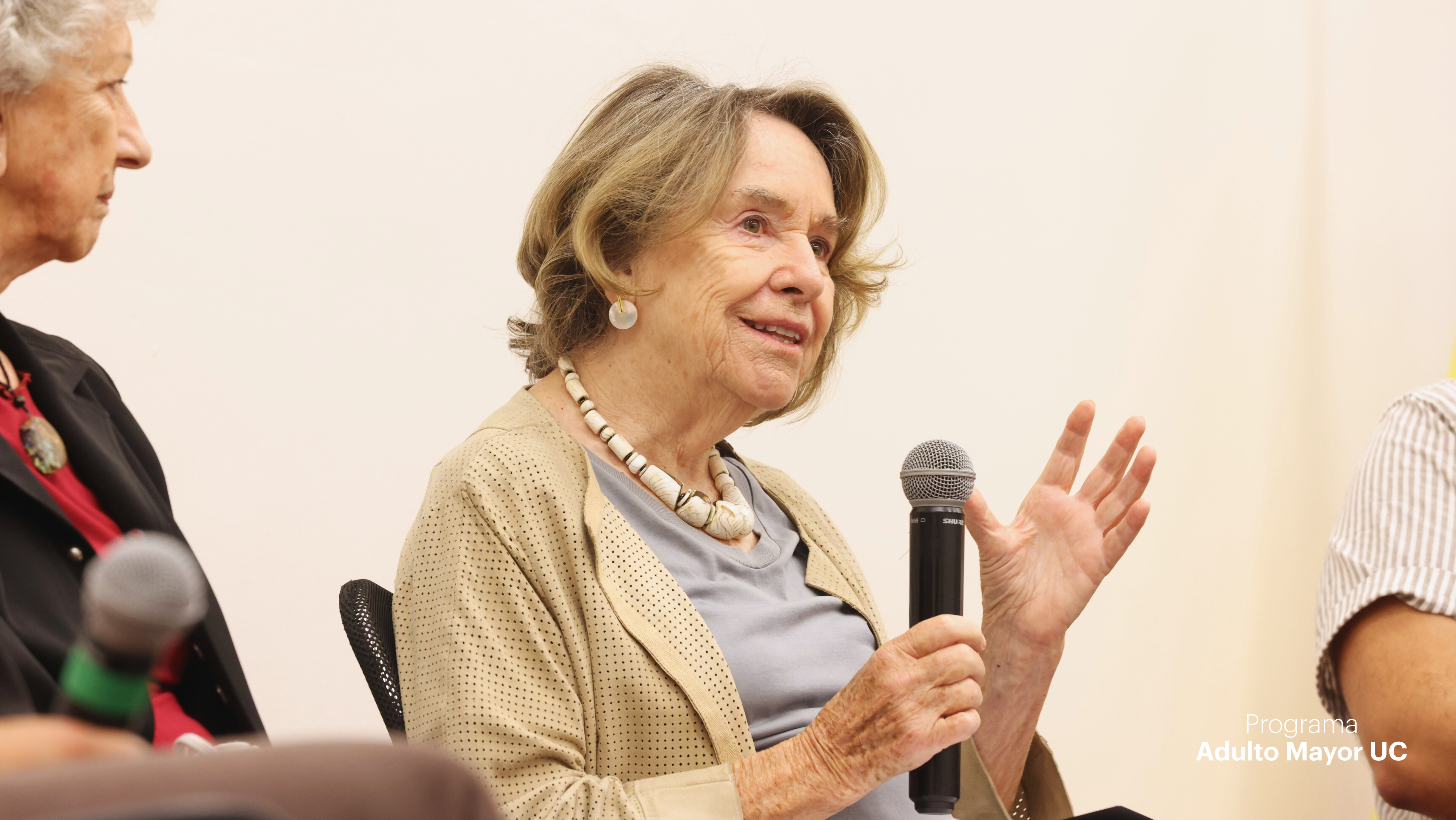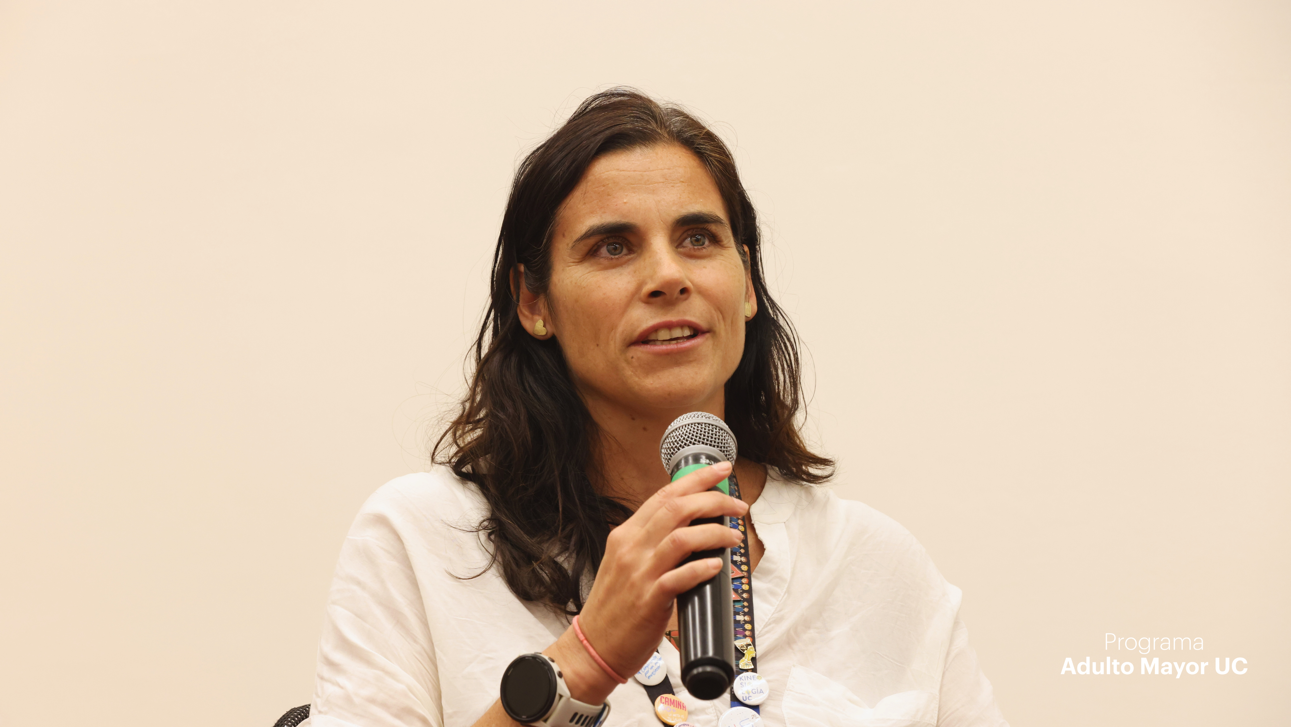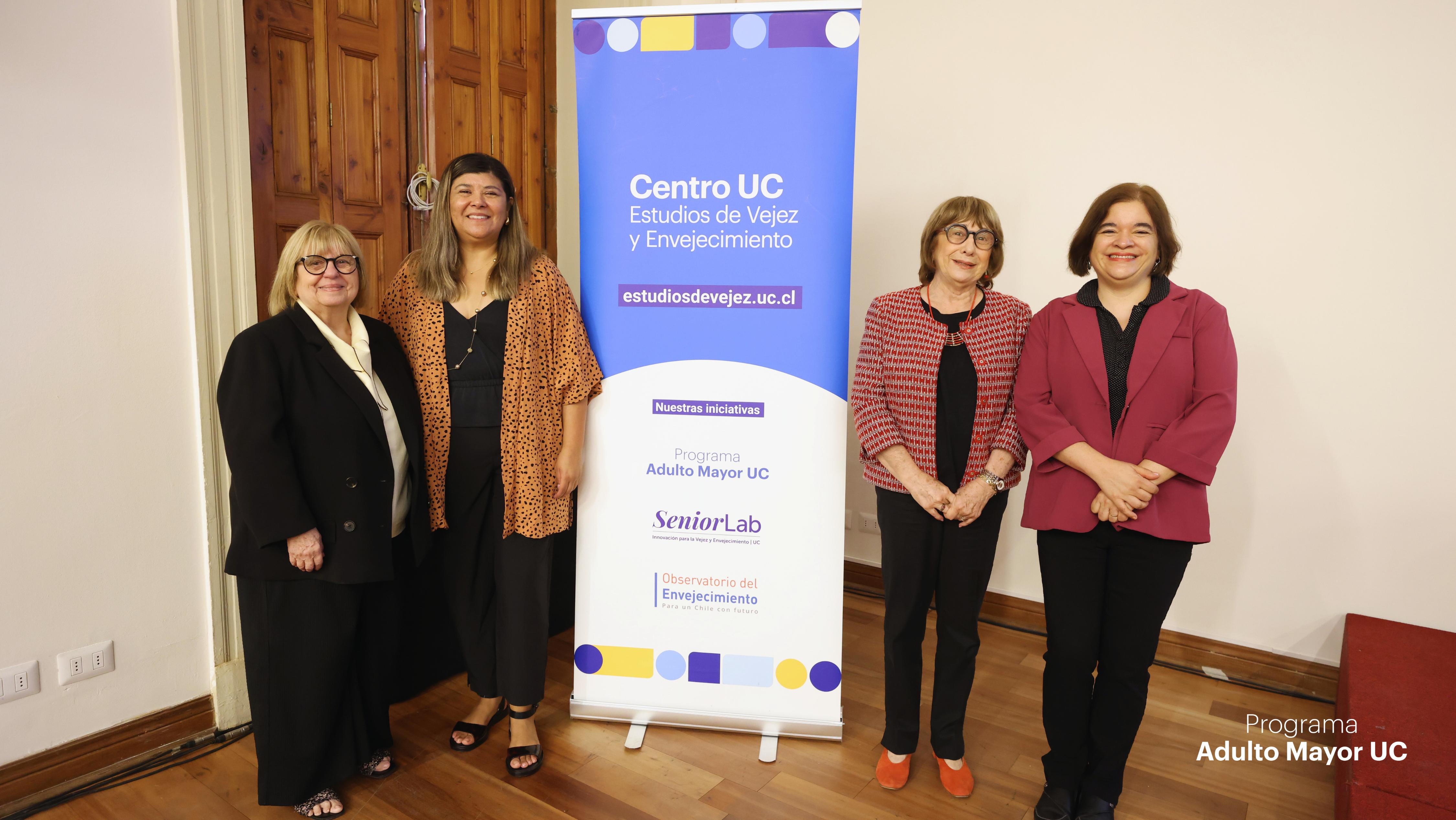 La jornada también incluyó un panel de conversación que reunió distintas miradas vinculadas al trabajo con personas mayores. En esta instancia participaron Alonso Calderón, cientista político y coordinador del programa 60+ Digital; Margarita Errázuriz, fundadora del Ciclo de Espiritualidad del Programa Adulto Mayor UC; Cecilia Marticorena, estudiante de los cursos del programa e integrante del Comité Asesor de Personas Mayores; Fernanda Calvo, kinesióloga UC, docente y líder del programa Camina 60+; junto a la propia Montse Amorós como experta invitada.
